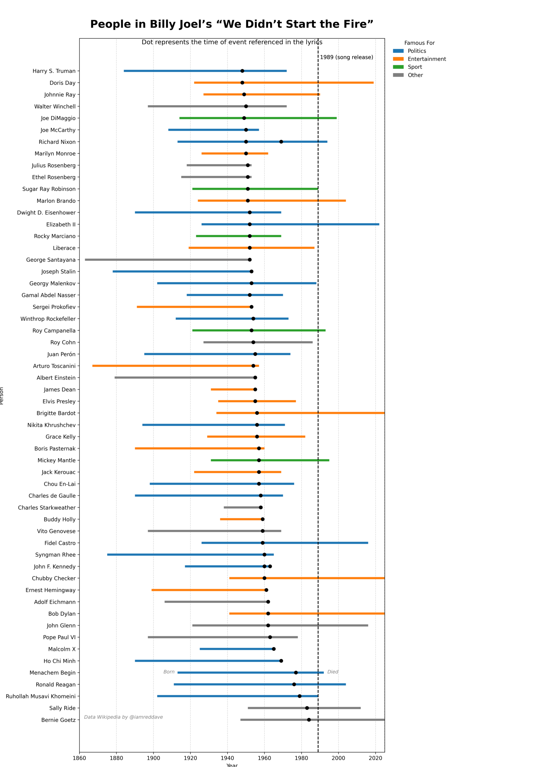 - The death of Brigitte Bardot, 1960s sex symbol turned militant animal rights activist, means there are now only three people mentioned in the 1989 Billy Joel song We Didn’t Start the Fire who are still alive: Chubby Checker, Bob Dylan, and… Bernie Goetz. – via Simon Kuestenmacher